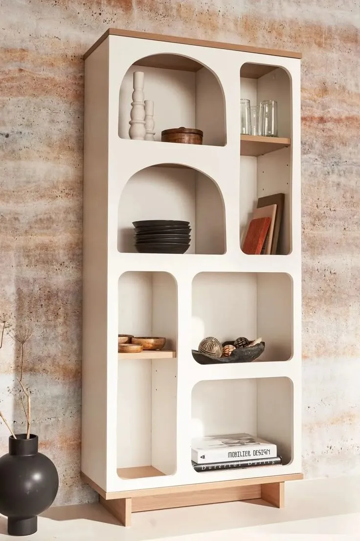 Este es un estante alto y moderno con un diseño distintivo. Presenta una estructura principal de color blanco con bordes y patas de madera clara, creando un contraste cálido y limpio. Los compartimentos de almacenamiento tienen formas redondeadas en la parte superior, algunos con forma de arco completo y otros solo con la parte superior curva, lo que le da un aspecto suave y orgánico. Los estantes interiores son de madera clara y dividen el espacio en varios niveles de diferentes alturas y anchos, ofreciendo versatilidad para exhibir una variedad de objetos decorativos y libros. Su diseño vertical y las formas curvas lo convierten en una pieza de mobiliario elegante y funcional.