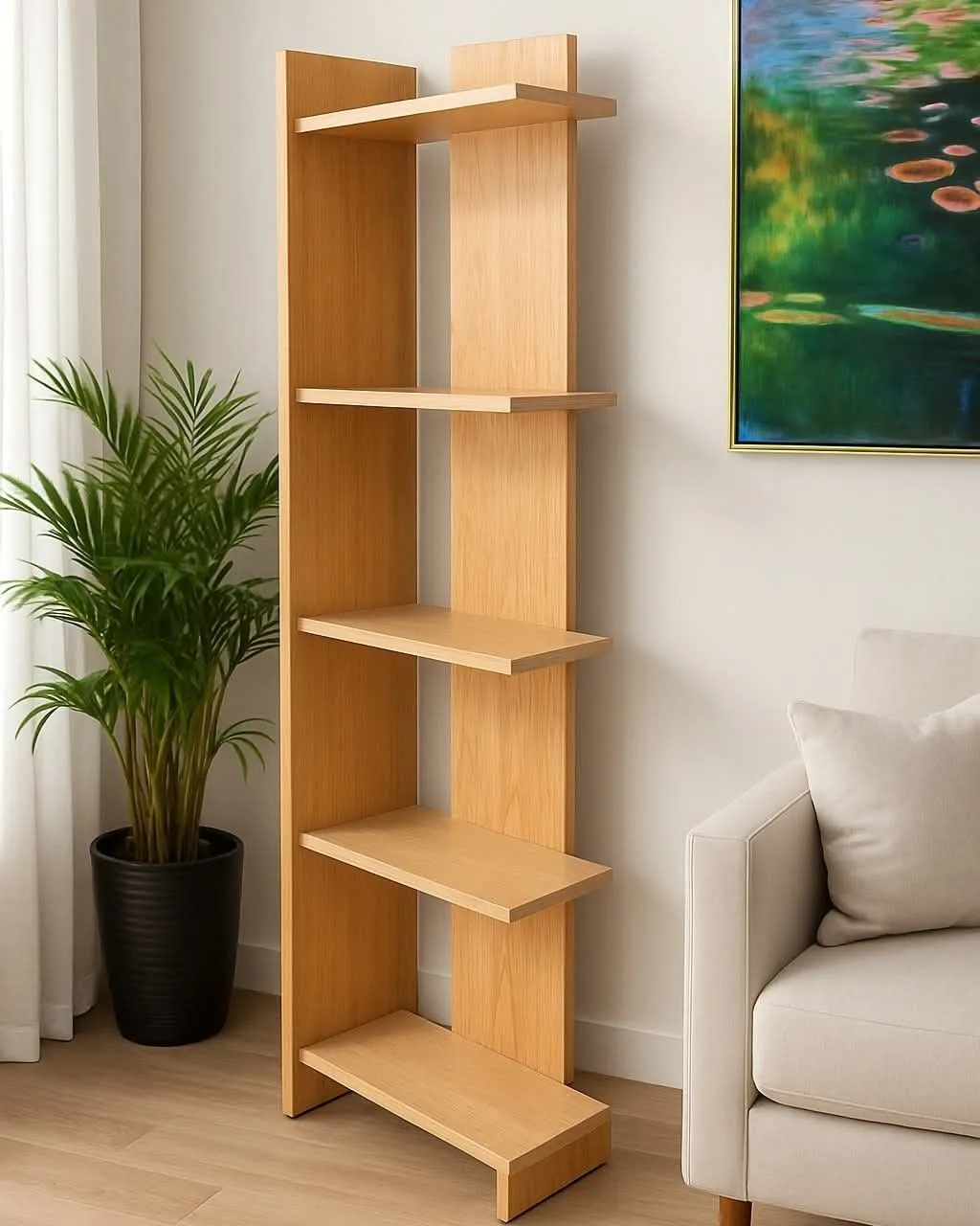 Está fabricado en madera con un acabado claro y presenta un diseño vertical estrecho con múltiples estantes.