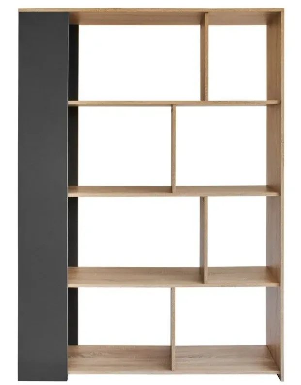 Es una estantería modular con un diseño moderno y asimétrico que combina espacios abiertos cuadrados y rectangulares. Está fabricada con tableros de melamina de Pelikano. El acabado de la imagen es Negro y roble claro , su diseño la hace ideal tanto para colocarla contra una pared como para usarla como separador de ambientes en salones, comedores u oficinas.