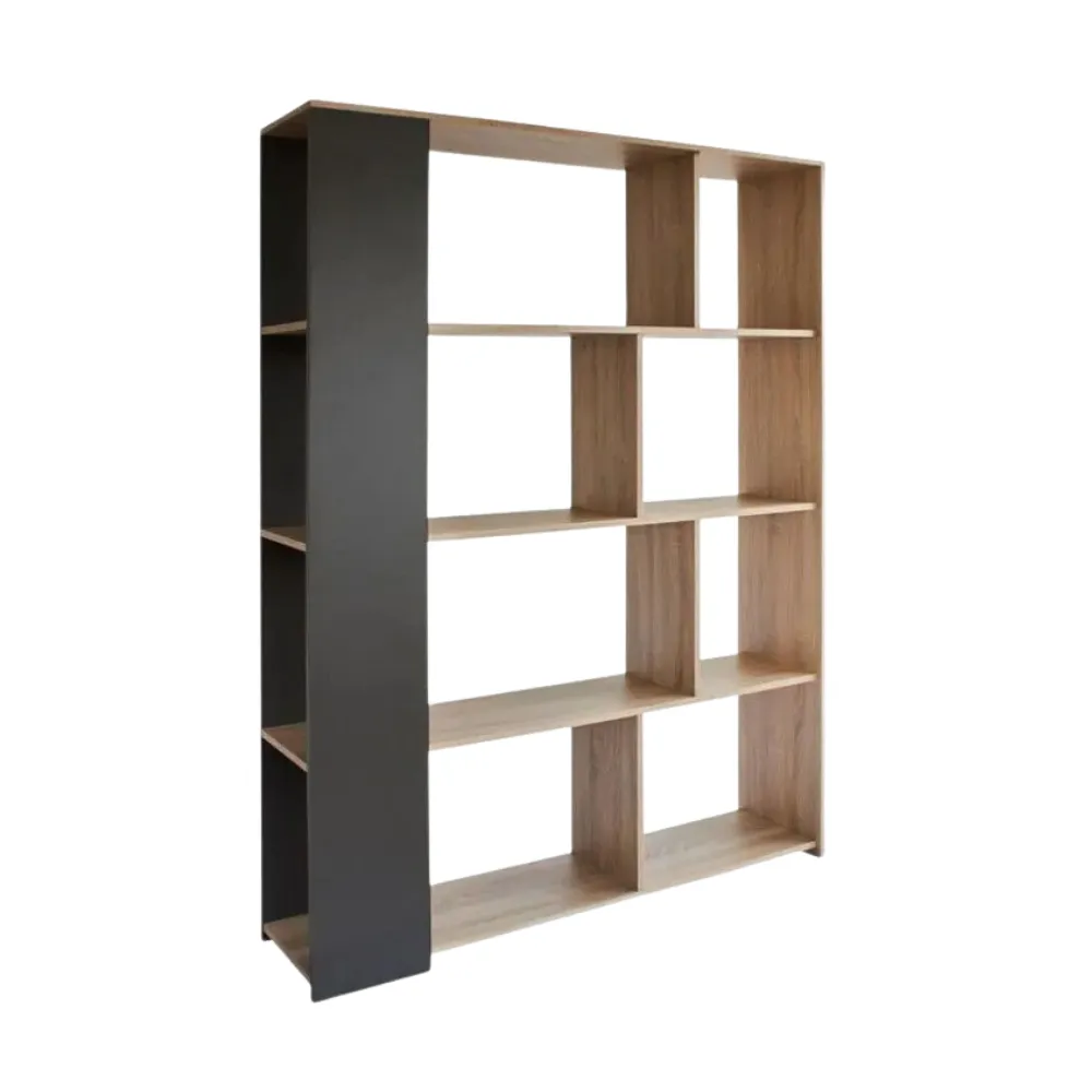 Estante robusto con contraste en negro y madera, aportando un toque moderno y elegante a grandes espacios.