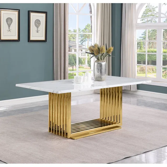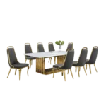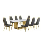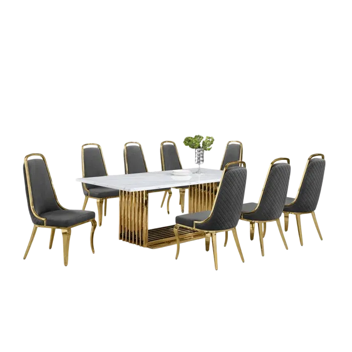 Esta gran mesa de comedor con diseño moderno, nos hace presente un largo tablero rectangular en tono claro con una base grande de dos soportes en color oro. Se le acompaña con ocho sillas con la base del mismo color oro las cuales estan tapizadas en un suave terciopelo de color gris oscuro con detalles dorados, de modo así que complemente la estética de la mesa.