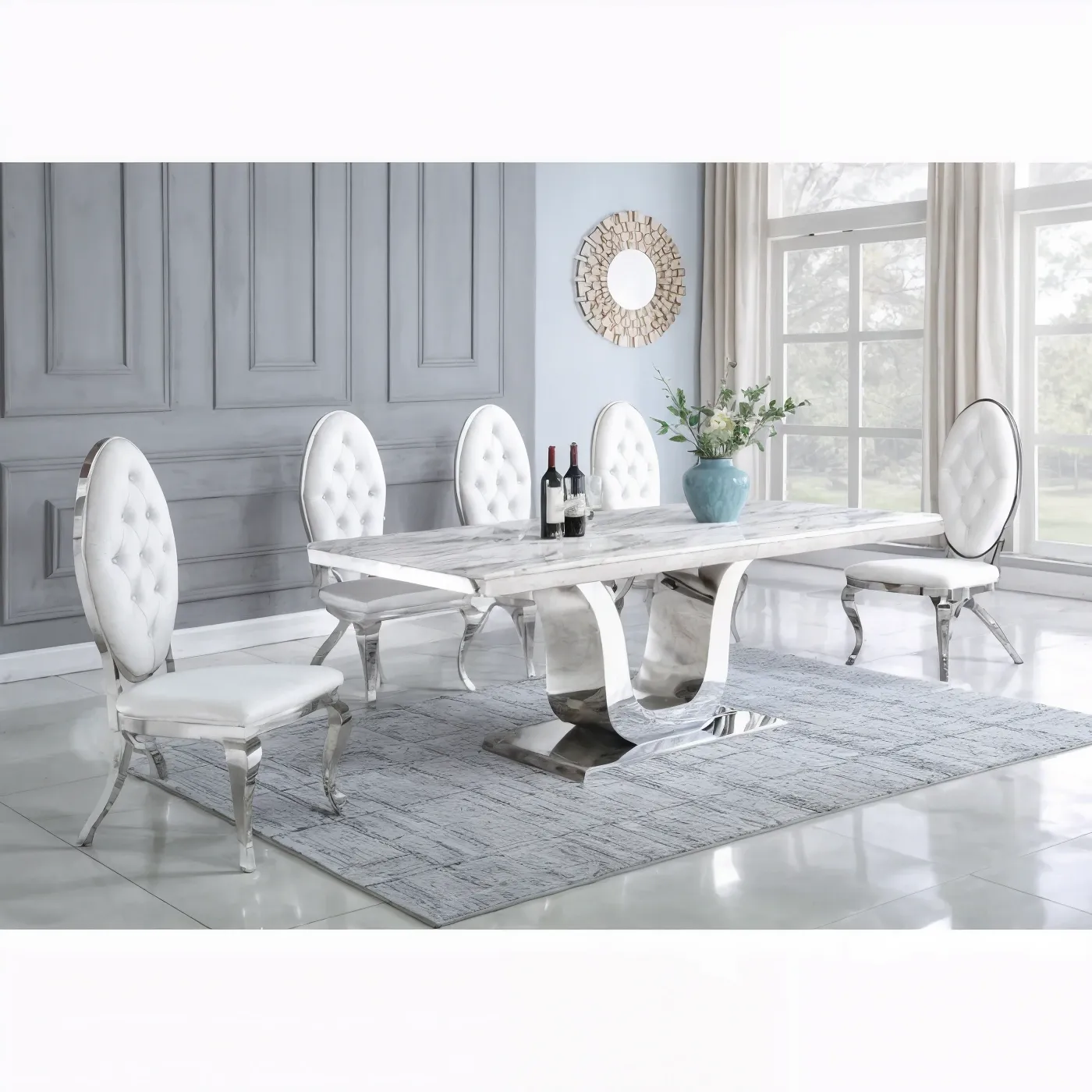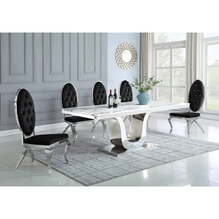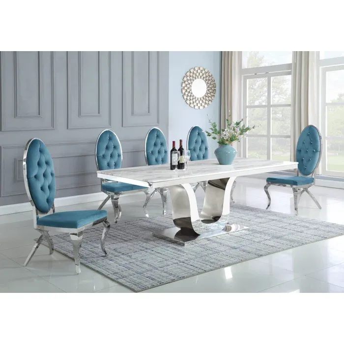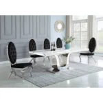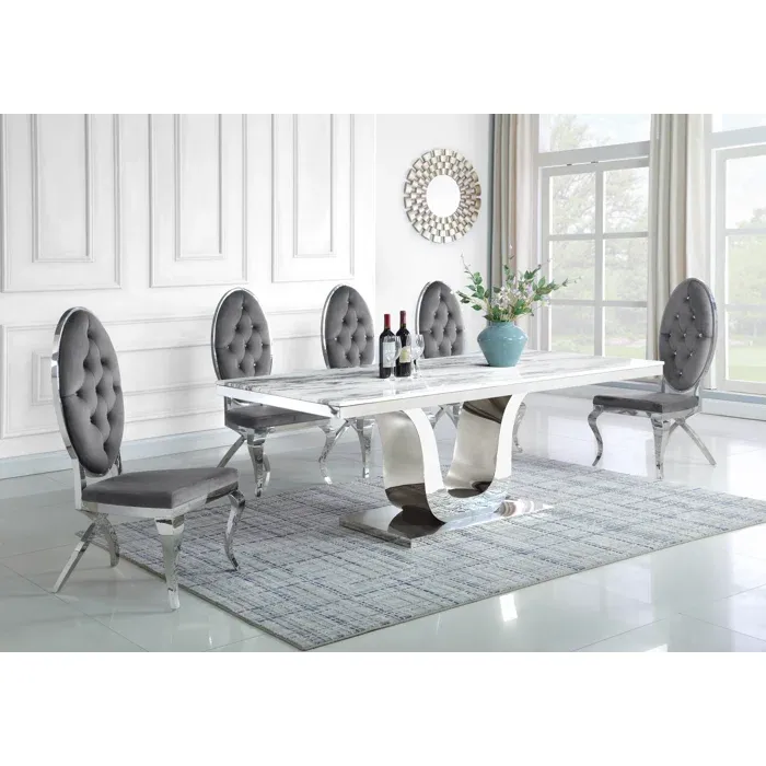 Esta diseño de comedor con diseño extravagante, nos hace presente un largo tablero rectangular en tono claro con una base grande de un soporte en color blanco y gris. Se le acompaña con ocho sillas con la base de color gris las cuales estan tapizadas en un suave terciopelo de color blanco con detalles plateados, de modo así que complemente la estética de la mesa.