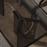 Esta mesa de comedor posee un diseño sencillo, con un tablero circular a base de vidrio grueso, con una distintiva base de cuatro soportes de aluminio en tonos grises. Rodeando la mesa, se disponen cuatro sillas de diseño moderno, tapizadas en un suave terciopelo gris oscuro con detalles en color plata con patas delgadas, complementando así la estética de la mesa.