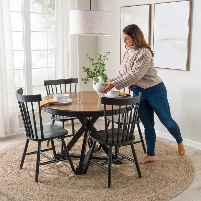 Este diseño de comedor esta pensado para quienes buscan sofisticación y confort, este comedor cuenta con una mesa redonda de acabado color madera y base con cuatro soportes largos que aporta un aire minimalista y moderno. Acompañado de cuatro sillas amplias con estructura delgada en color negro y madera, el conjunto brinda una estética refinada perfecta para espacios elegantes y actuales