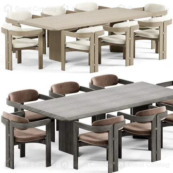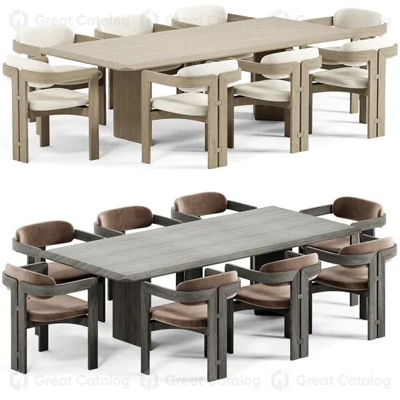 Esta mesa de comedor de diseño moderno presenta un tablero rectangular con una superficie de madera oscura. Su base es distintiva, compuesta por cuatro soportes de madera oscura, aportando un toque de originalidad y ligereza visual. La acompañan ocho sillas de madera, de líneas sencillas y funcionales, ideal para un comedor contemporáneo con énfasis en la funcionalidad y el diseño limpio.