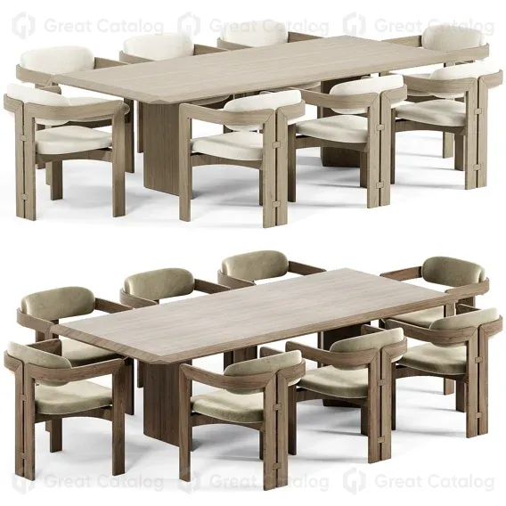Esta gran mesa de comedor exhibe un diseño vintage. Su extenso tablero rectangular presenta una superficie con una textura que sugiere suavidad. Rodeando la mesa, se disponen ocho sillas de diseño elegante, tapizadas en un suave terciopelo blanco y con detalles de madera complementando la estética de la mesa. El conjunto irradia opulencia y estilo, ideal para un comedor de gran tamaño que busque una pieza central impactante y refinada.