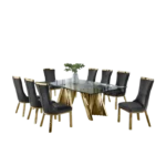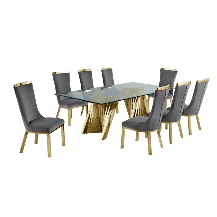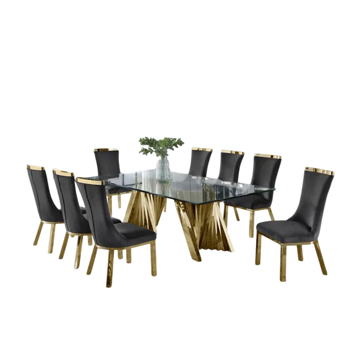 Esta extravagante mesa de comedor con diseño moderno, nos hace presente un largo tablero rectangular de vidrio grueso con una base grande de dos soportes en color oro. Se le acompaña con ocho sillas con la base del mismo color oro las cuales estan tapizadas en un suave terciopelo de color gris oscuro con detalles dorados, de modo así que complemente la estética de la mesa.
