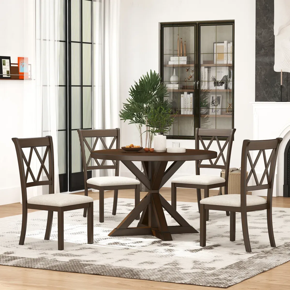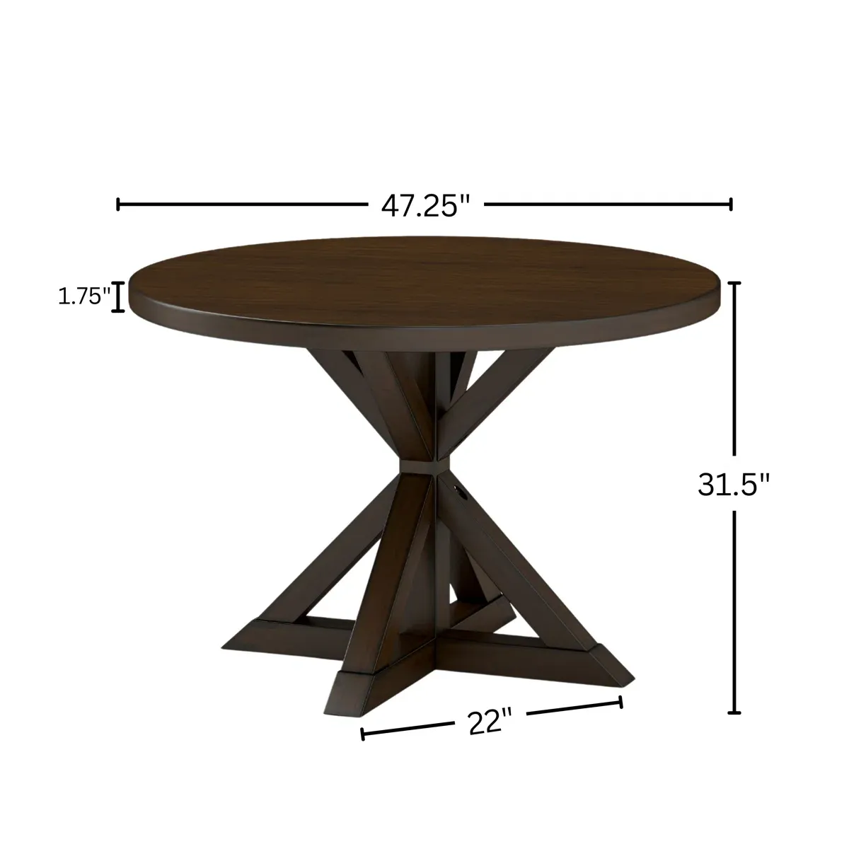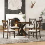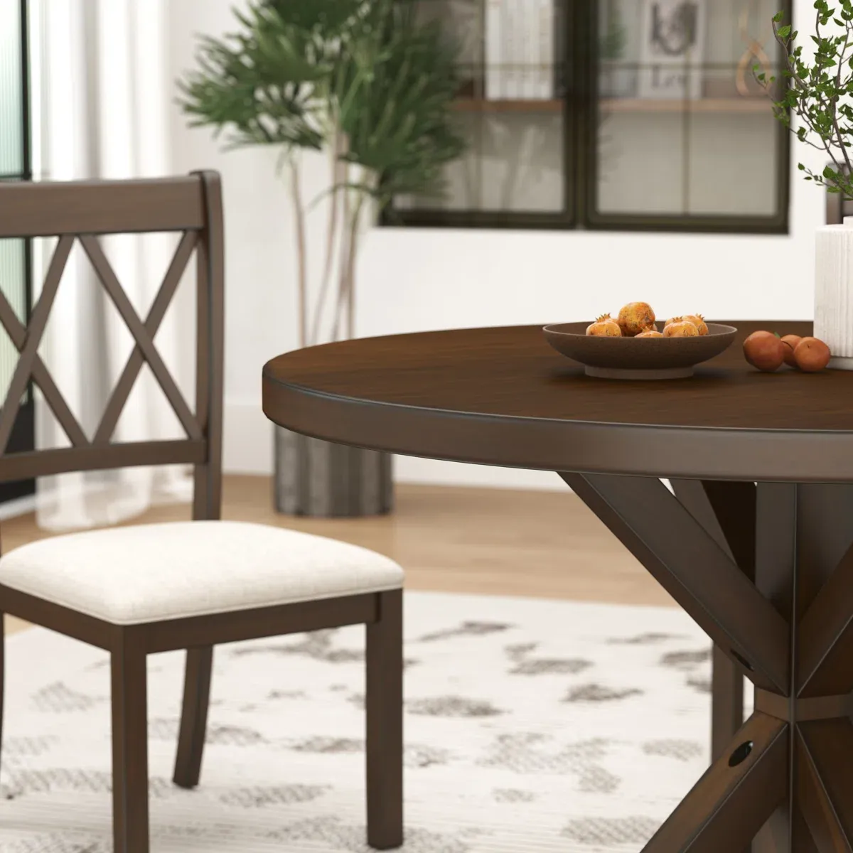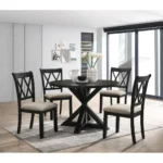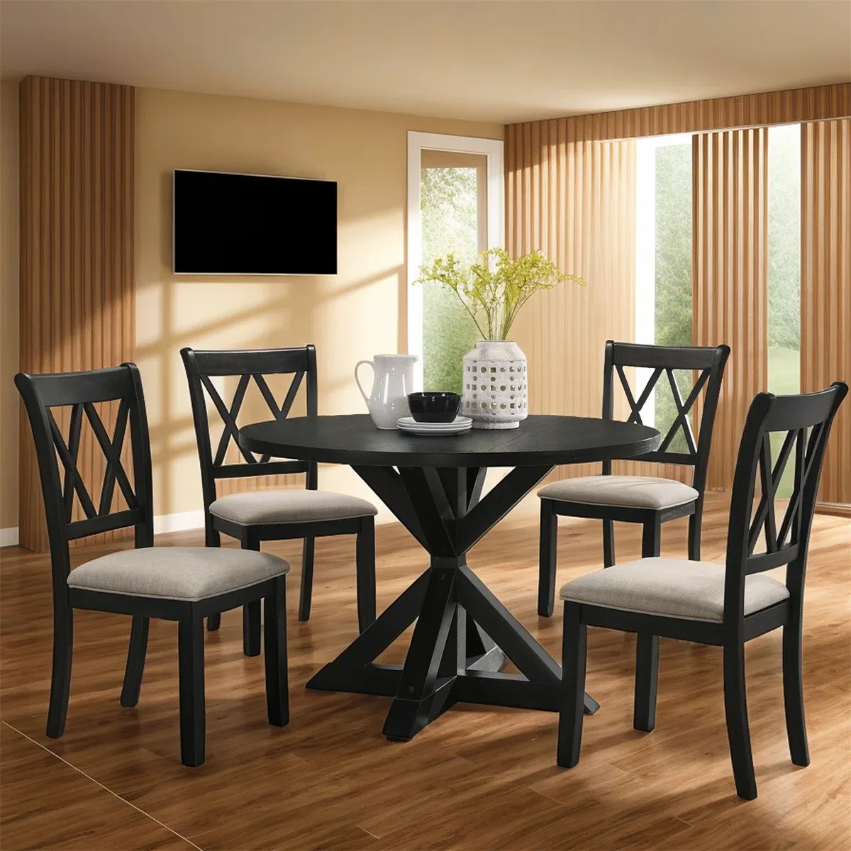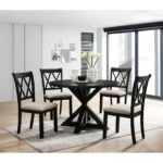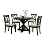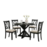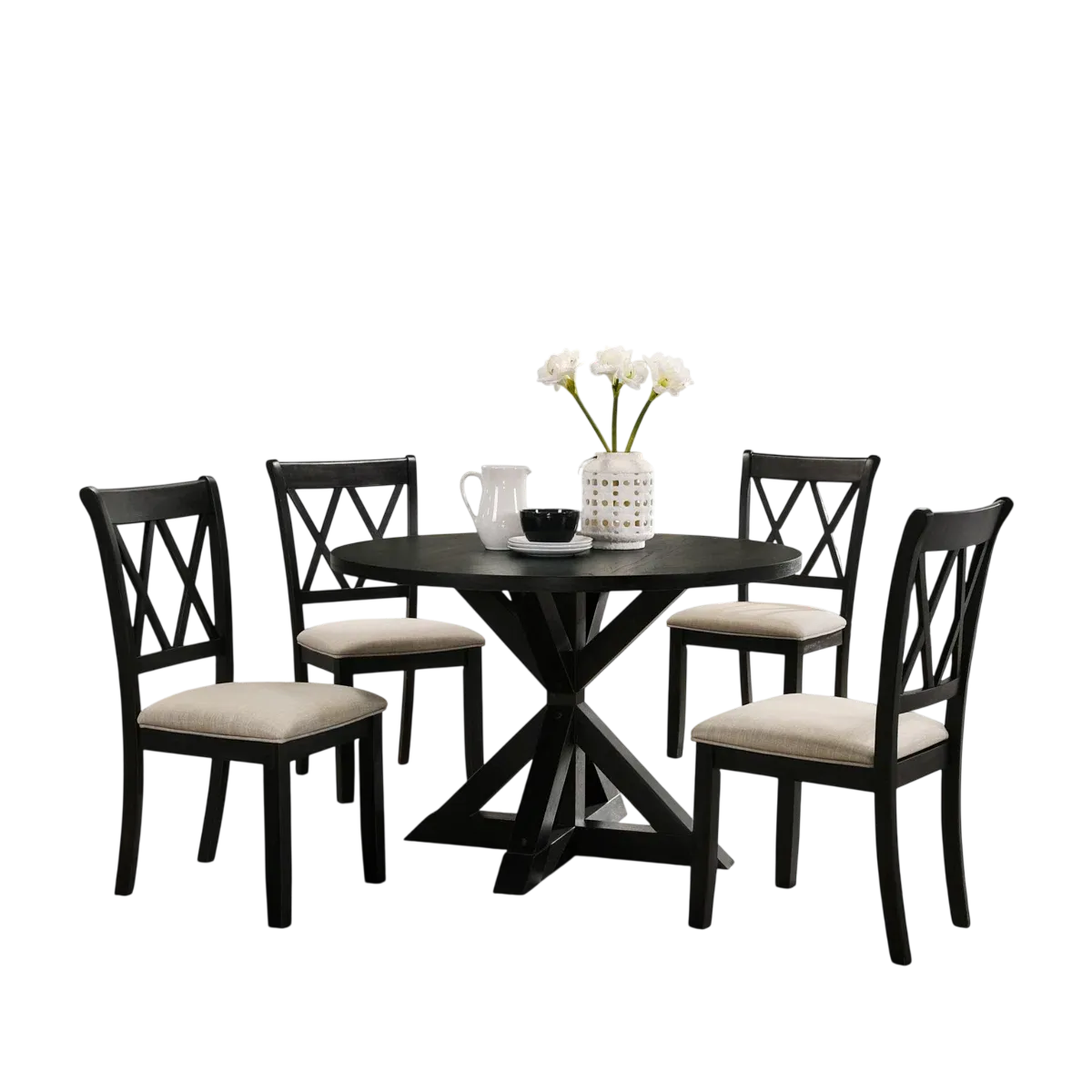 Este diseño de comedor esta pensado para quienes buscan sofisticación y confort, este comedor cuenta con una mesa redonda de acabado color madera y base con cuatro soportes largos que aporta un aire minimalista y moderno. Acompañado de cuatro sillas amplias con estructura delgada en color negro y madera, el conjunto brinda una estética refinada perfecta para espacios elegantes y actuales