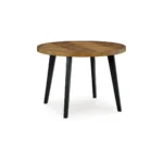 Este diseño de comedor esta pensado para quienes buscan sofisticación y confort, este comedor cuenta con una mesa redonda de acabado color madera y base con cuatro soportes largos que aporta un aire minimalista y moderno. Acompañado de cuatro sillas amplias con estructura delgada en color negro y madera, el conjunto brinda una estética refinada perfecta para espacios elegantes y actuales