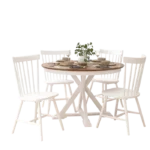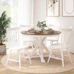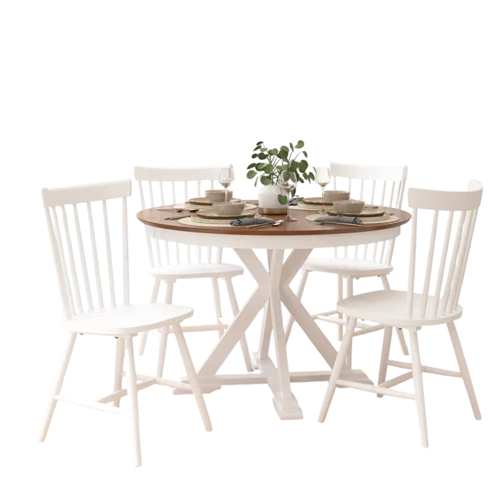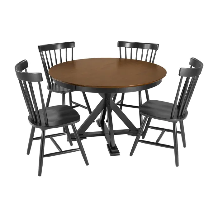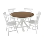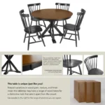Este diseño de comedor esta pensado para quienes buscan sofisticación y confort, este comedor cuenta con una mesa redonda de acabado color madera y base con cuatro soportes largos que aporta un aire minimalista y moderno. Acompañado de cuatro sillas amplias con estructura delgada en color negro y madera, el conjunto brinda una estética refinada perfecta para espacios elegantes y actuales