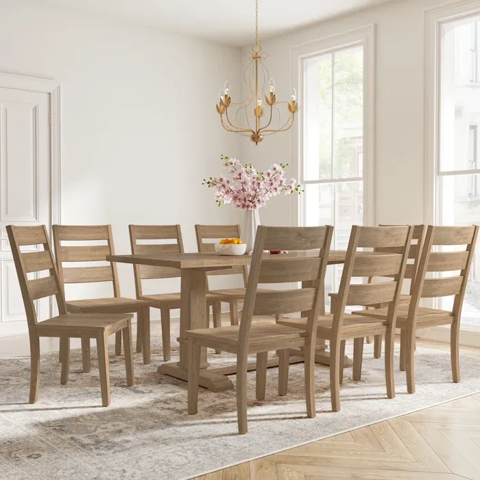 Esta mesa de comedor presenta un diseño escandinavo sencillo y cálido. Su tablero rectangular, de madera clara con un acabado natural, se apoya sobre una base de cuatro soportes, también en un tono claro. La acompañan ocho sillas de estilo similar forradas de color blanco, ofreciendo confort y elegancia discreta. El conjunto se integra armoniosamente en un ambiente luminoso y acogedor, con una alfombra grande en tonos neutros.