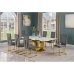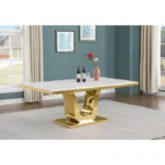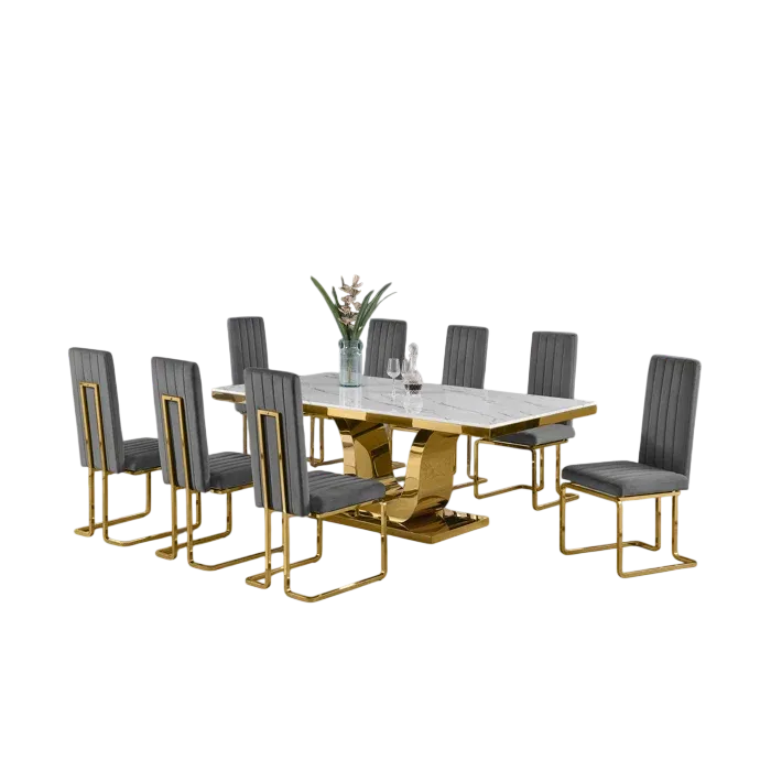 Esta gran mesa de comedor con diseño sofisticado, nos hace presente un largo tablero rectangular en tonos claros con una base grande y distintitva en color oro. A su alrededor se le acompaña con ocho sillas con la base del mismo color oro las cuales estan tapizadas en un suave terciopelo de color gris oscuro de modo así que complemente la estética de la mesa.