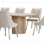 Esta diseño de comedor con diseño extravagante, nos hace presente un largo tablero rectangular en tono claro con una base grande de un soporte en color blanco y gris. Se le acompaña con ocho sillas con la base de color gris las cuales estan tapizadas en un suave terciopelo de color blanco con detalles plateados, de modo así que complemente la estética de la mesa.