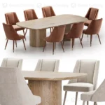 Esta moderna mesa de comedor presenta un elegante tablero ovalado con una superficie suave y ligera. Está rodeada por ocho sillas de diseño contemporáneo, tapizadas en un vibrante color tierra y sostenidas por patas de madera. El conjunto crea un ambiente fresco y sofisticado, ideal para espacios de comedor modernos y luminosos. Sobre la mesa, se aprecian detalles decorativos como una laptop, un libro y una pequeña planta en maceta, sugiriendo un espacio multifuncional y con estilo.