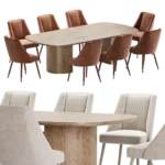 Esta mesa de comedor de diseño moderno presenta un tablero rectangular con una superficie de madera oscura. Su base es distintiva, compuesta por cuatro soportes de madera oscura, aportando un toque de originalidad y ligereza visual. La acompañan ocho sillas de madera, de líneas sencillas y funcionales, ideal para un comedor contemporáneo con énfasis en la funcionalidad y el diseño limpio.