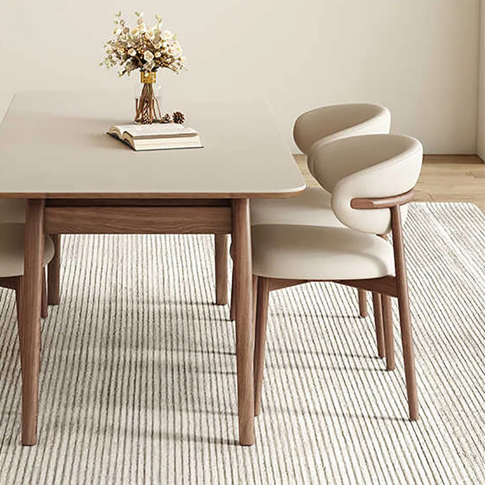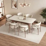 Este comedor presenta una mesa rectangular con una superficie lisa de color claro, sostenida por una base de madera con un diseño curvo y orgánico. Alrededor de la mesa se disponen seis sillas de diseño elegante. Cada silla cuenta con patas de madera y un asiento y respaldo tapizados en un material de color crema o beige claro, con un detalle de madera curvada que rodea la parte superior del respaldo. La disposición de las sillas sugiere comodidad y un estilo moderno y sofisticado. Sobre la mesa, se encuentran un libro abierto y un pequeño jarrón con flores, añadiendo un toque de calidez y vida al conjunto.