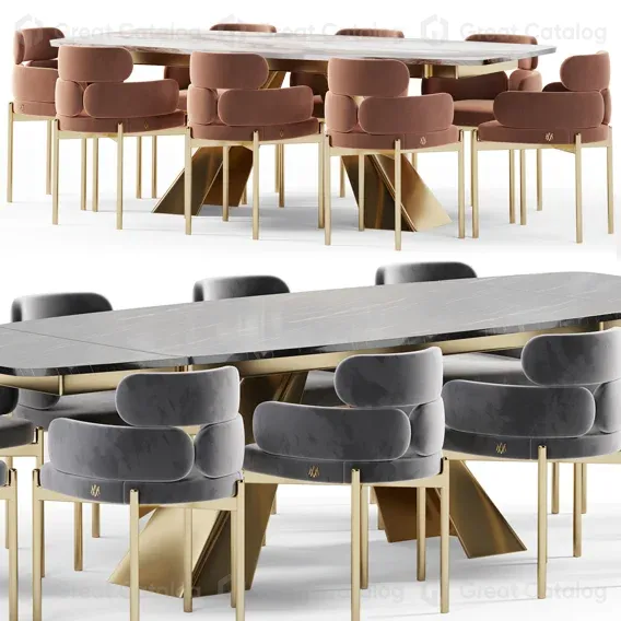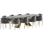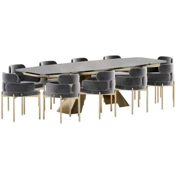 Esta imponente mesa de comedor exhibe un diseño contemporáneo y lujoso. Su extenso tablero rectangular presenta una superficie con una textura que sugiere piedra natural en tonos grises, posiblemente mármol o similar. La base es una obra de arte geométrica, con soportes angulares y planos en un acabado dorado brillante, aportando un toque de sofisticación y modernidad. Rodeando la mesa, se disponen ocho sillas de diseño elegante, tapizadas en un suave terciopelo gris oscuro y con detalles dorados en sus patas delgadas, complementando la estética de la mesa. El conjunto irradia opulencia y estilo, ideal para un comedor de gran tamaño que busque una pieza central impactante y refinada.