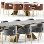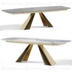 Esta gran mesa de comedor con diseño moderno, nos hace presente un largo tablero rectangular en tono claro con una base grande de dos soportes en color oro. Se le acompaña con ocho sillas con la base del mismo color oro las cuales estan tapizadas en un suave terciopelo de color gris oscuro con detalles dorados, de modo así que complemente la estética de la mesa.