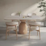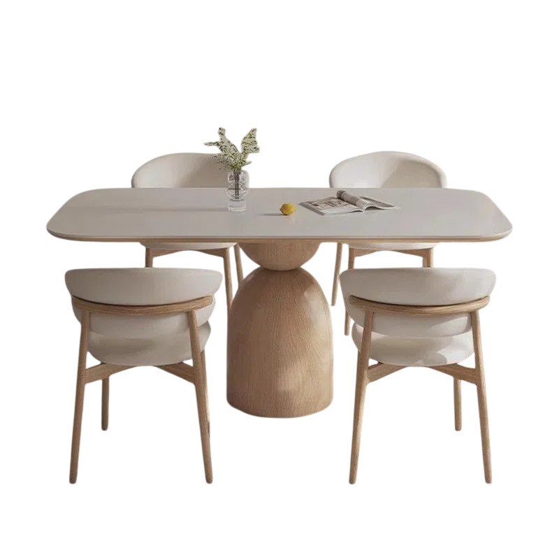 Esta mesa de comedor de diseño moderno presenta un tablero rectangular con esquinas redondeadas y una superficie clara. Su base es distintiva, compuesta por un soporte de madera clara con un diseño geométrico que incluye recortes circulares verticales, aportando un toque de originalidad y ligereza visual. La acompañan cuatro sillas de madera clara con asientos tapizados en un tono claro, de líneas sencillas y funcionales.
