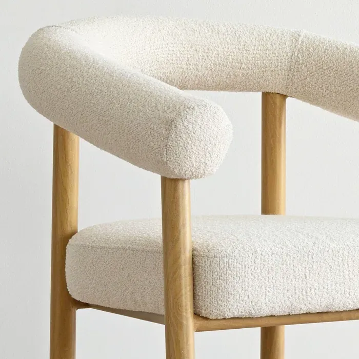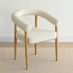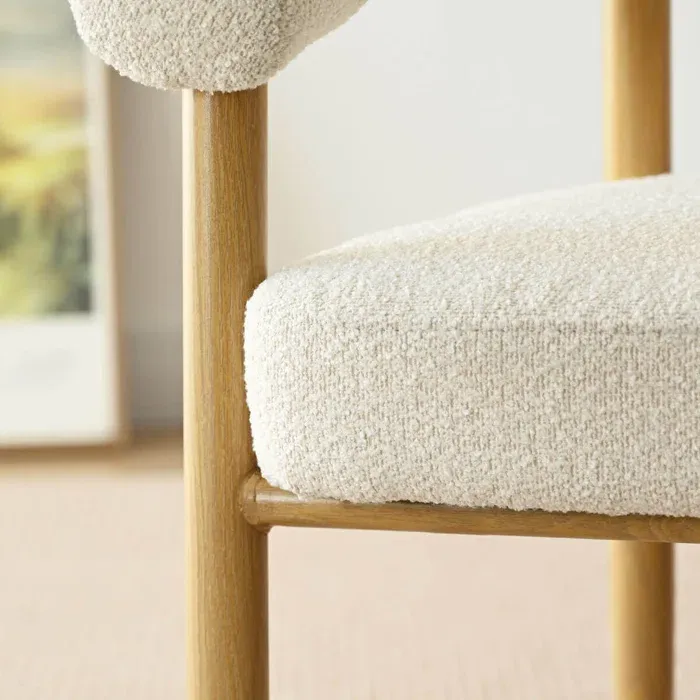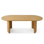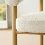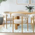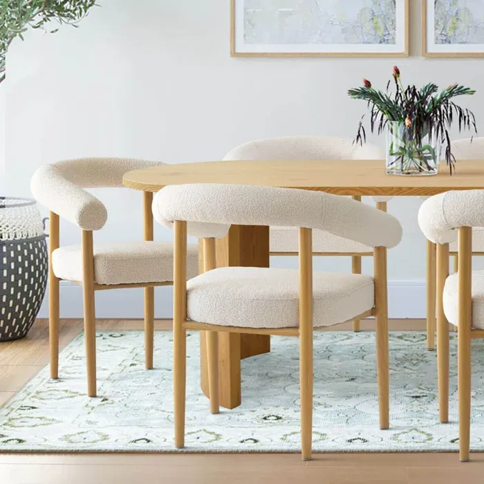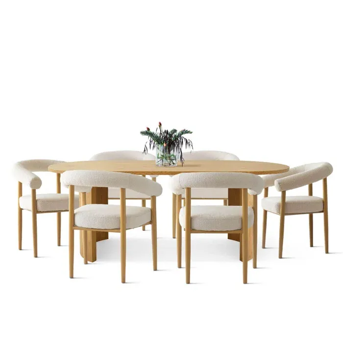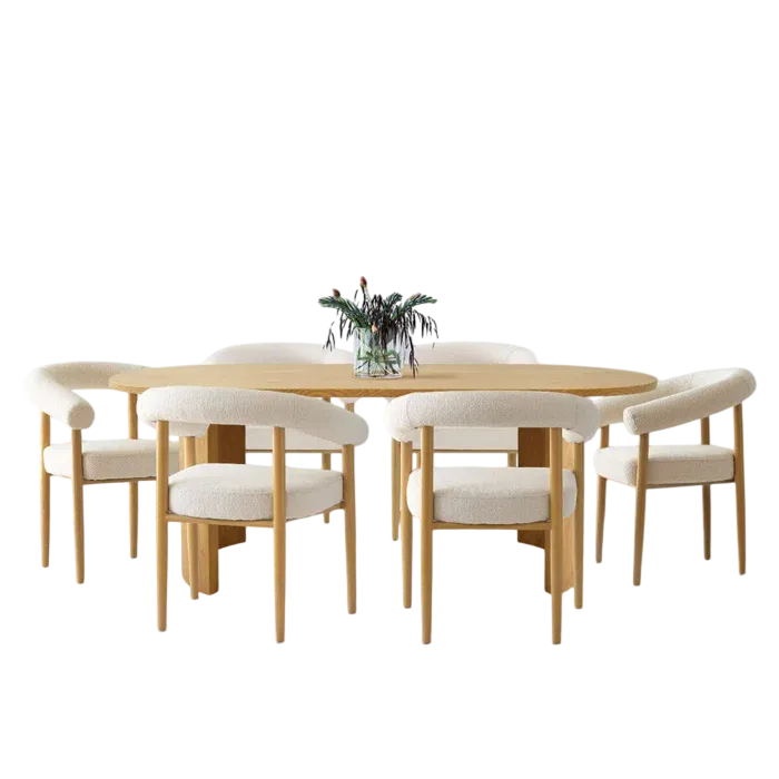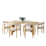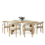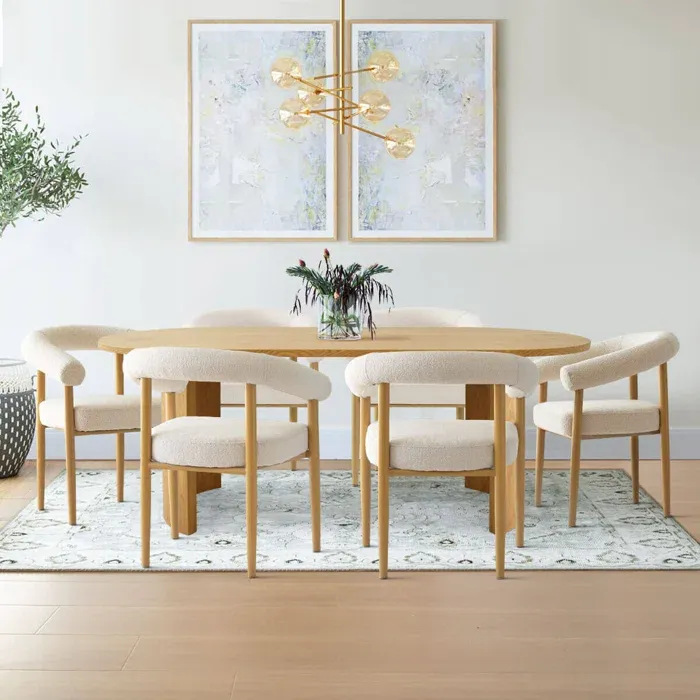 Esta mesa de comedor presenta un diseño escandinavo sencillo y cálido. Su tablero rectangular, de madera clara con un acabado natural, se apoya sobre una base de cuatro soportes, también en un tono claro. La acompañan ocho sillas de estilo similar forradas de color blanco, ofreciendo confort y elegancia discreta. El conjunto se integra armoniosamente en un ambiente luminoso y acogedor, con una alfombra grande en tonos neutros.