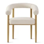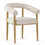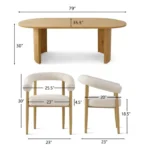 Esta mesa de comedor de diseño moderno presenta un tablero rectangular con esquinas redondeadas y una superficie clara. Su base es distintiva, compuesta por un soporte de madera clara con un diseño geométrico que incluye recortes circulares verticales, aportando un toque de originalidad y ligereza visual. La acompañan cuatro sillas de madera clara con asientos tapizados en un tono claro, de líneas sencillas y funcionales.