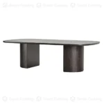 Esta gran mesa de comedor posee un diseño urbano y artesanal, posee un largo tablero rectangular con bordes redondeados con una textura suave y cómoda. Rodeando la mesa, se disponen ocho sillas de diseño urbano, tapizadas en un suave terciopelo gris con detalles en color plata con patas delgadas, complementando así la estética de la mesa, ideal para un comedor contemporáneo con énfasis en la funcionalidad y el diseño limpio.