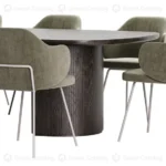 Este diseño de comedor esta pensado para quienes buscan sofisticación y confort, este comedor cuenta con una mesa redonda de acabado color madera y base con cuatro soportes largos que aporta un aire minimalista y moderno. Acompañado de cuatro sillas amplias con estructura delgada en color negro y madera, el conjunto brinda una estética refinada perfecta para espacios elegantes y actuales