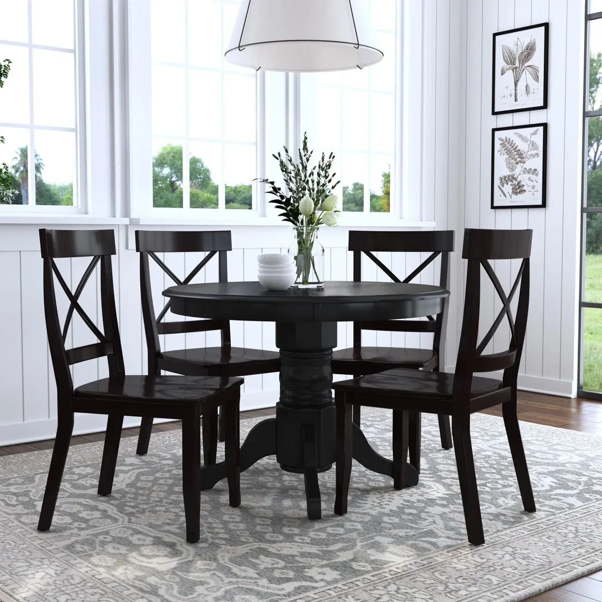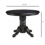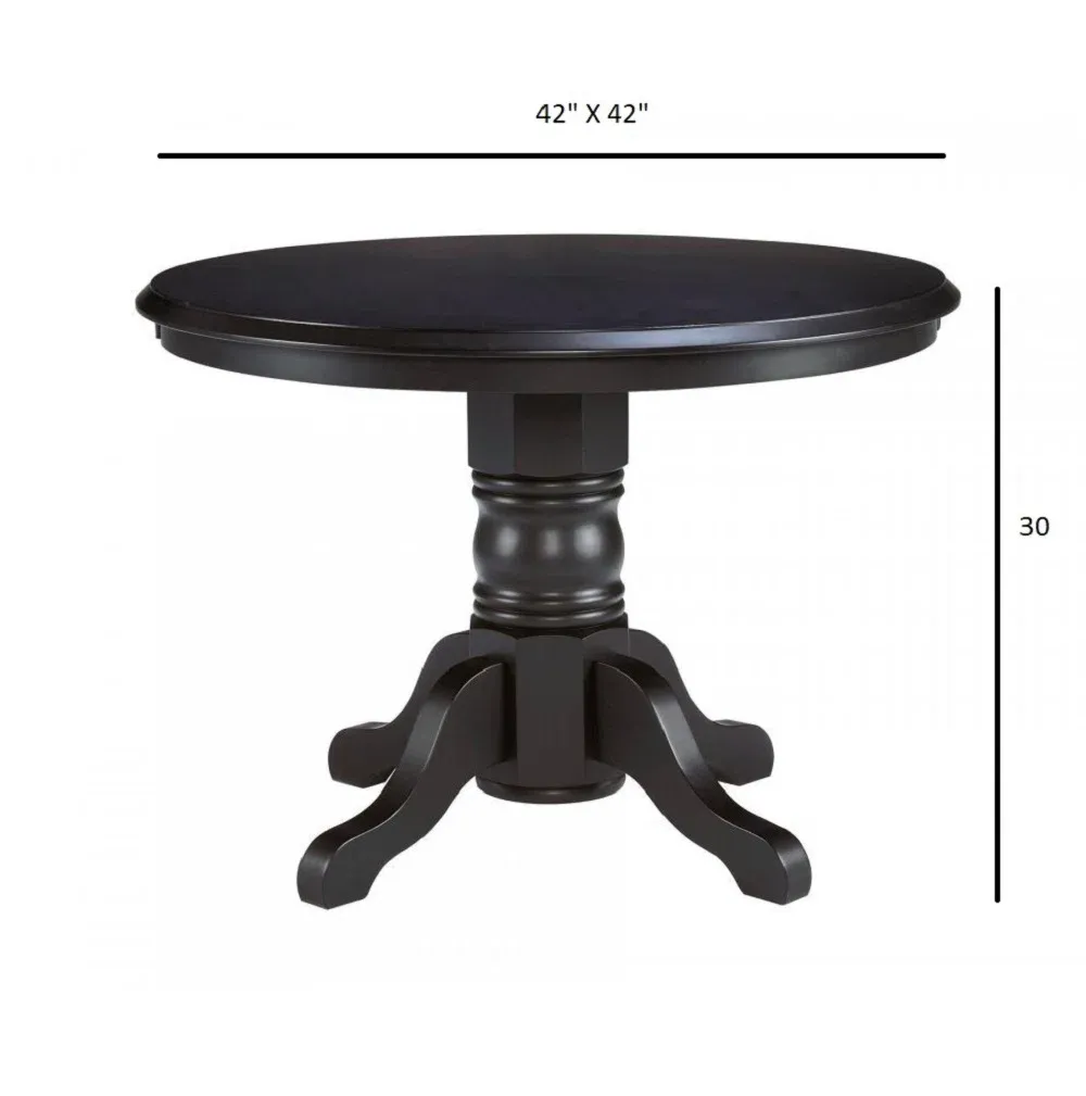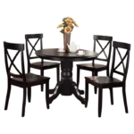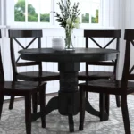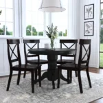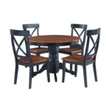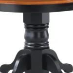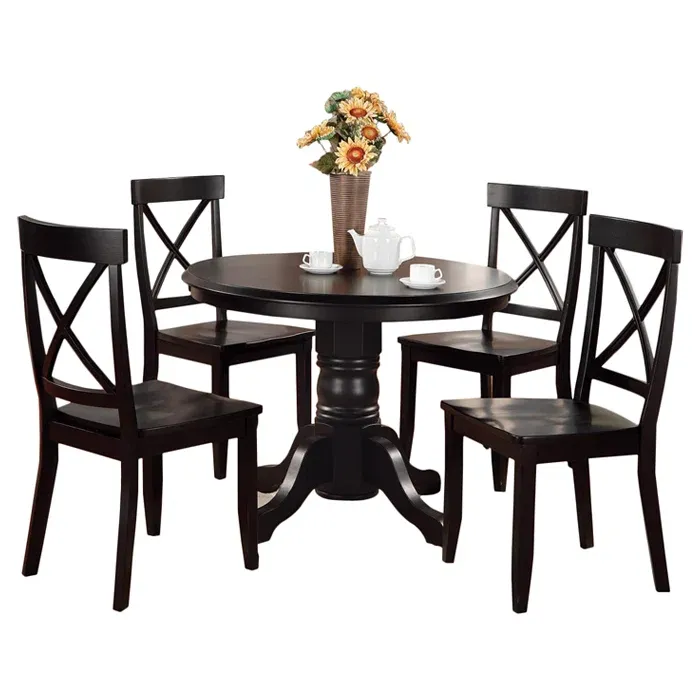 Este diseño de comedor esta pensado para quienes buscan sofisticación y confort, este comedor cuenta con una mesa redonda de acabado color madera y base con cuatro soportes largos que aporta un aire minimalista y moderno. Acompañado de cuatro sillas amplias con estructura delgada en color negro y madera, el conjunto brinda una estética refinada perfecta para espacios elegantes y actuales