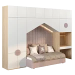 - El colchón se complementa con cojines en tonos neutros y mostaza, creando un ambiente acogedor. Perfecta para habitaciones infantiles, esta cama integra descanso, almacenamiento y diseño en una sola estructura funcional y moderna.