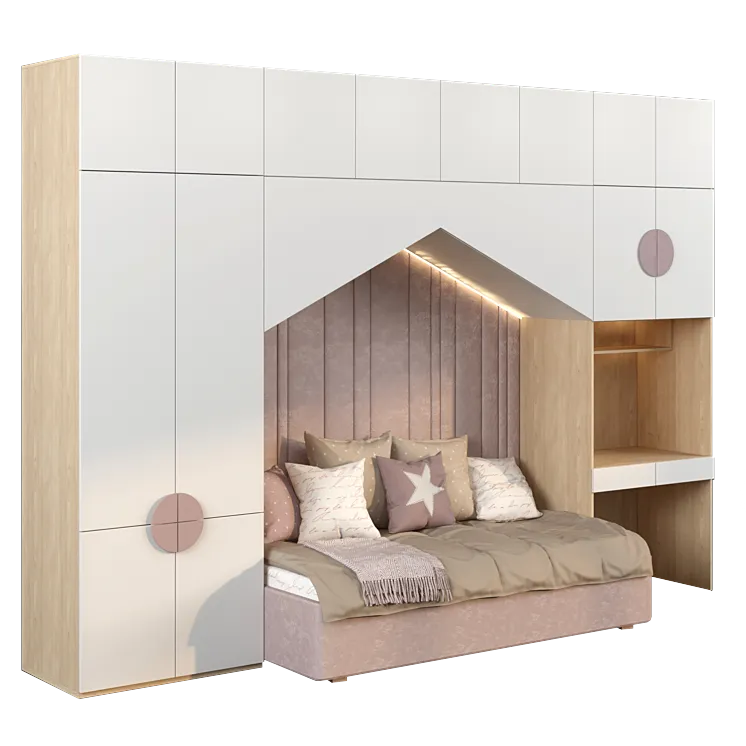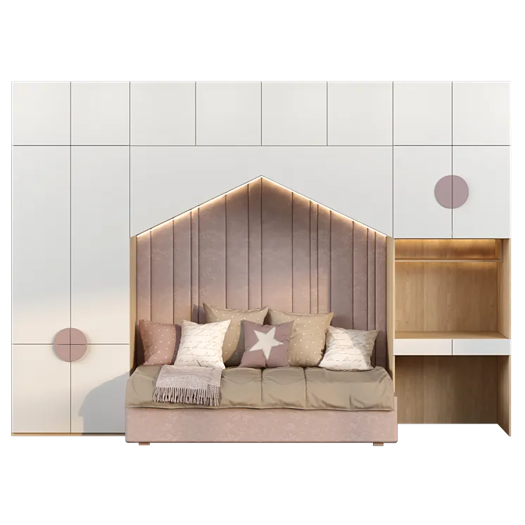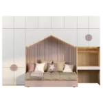 - Cama acogedora y temática: Cama individual con diseño de cabecero acolchado en forma de nube, en un atractivo color rosa pastel.