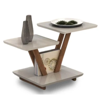 El diseño de la mesa incorpora múltiples niveles y espacios de almacenamiento, lo que la hace ideal para organizar objetos decorativos, libros, revistas, dispositivos electrónicos o incluso una laptop. La parte superior cuenta con una superficie amplia y firme, perfecta para colocar bebidas, floreros y otros elementos decorativos.