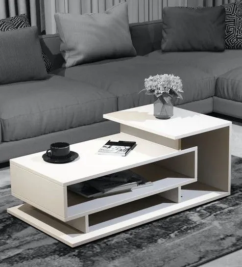 El diseño de la mesa incorpora múltiples niveles y espacios de almacenamiento, lo que la hace ideal para organizar objetos decorativos, libros, revistas, dispositivos electrónicos o incluso una laptop. La parte superior cuenta con una superficie amplia y firme, perfecta para colocar bebidas, floreros y otros elementos decorativos.