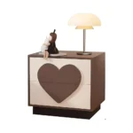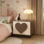 El diseño general de la mesita es minimalista y funcional, adaptándose a diferentes estilos de decoración infantil. Su combinación de colores suaves y su tirador en forma de corazón crean un ambiente cálido y acogedor en la habitación de la niña.