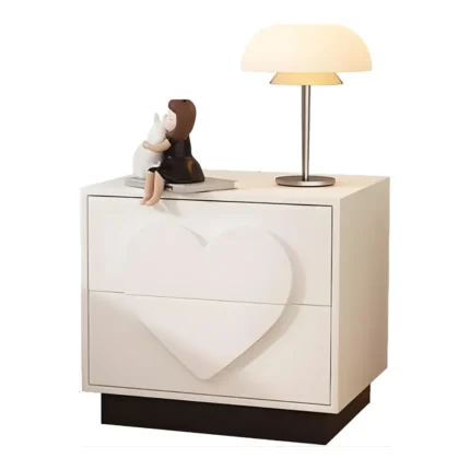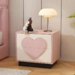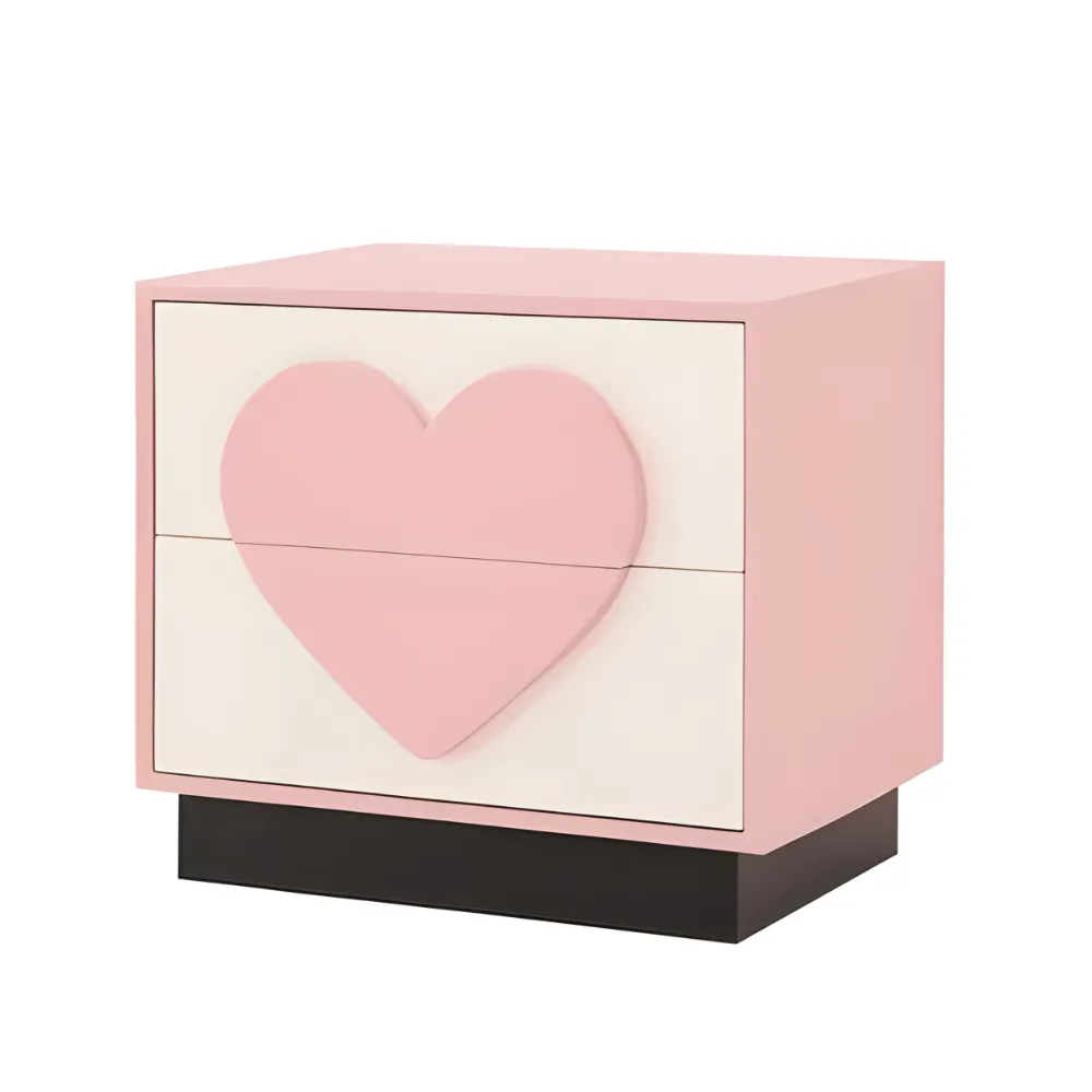 La mesita de noche presenta un diseño moderno y romántico, ideal para la habitación de una niña. Está compuesta por un cuerpo principal de forma cúbica, con una combinación de colores rosa suave y blanco crema. El cajón superior tiene un tirador en forma de corazón, que añade un toque dulce y original al diseño.