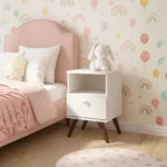 El diseño general de la mesita es minimalista y versátil, adaptándose a diferentes estilos de decoración infantil. Su color rosa suave y sus líneas limpias crean un ambiente tranquilo y acogedor en la habitación del niño.