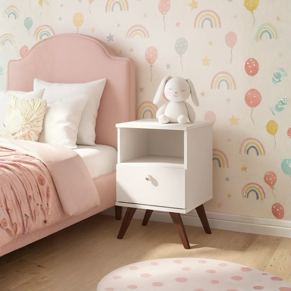 La mesita de noche presenta un diseño sencillo y funcional, ideal para la habitación de un niño. Está compuesta por un cuerpo principal de forma cúbica, pintado en un tono rosa suave, con un cajón en la parte inferior y un compartimento abierto en la parte superior. El cajón cuenta con un tirador redondo de color plateado, que añade un toque de contraste al diseño.