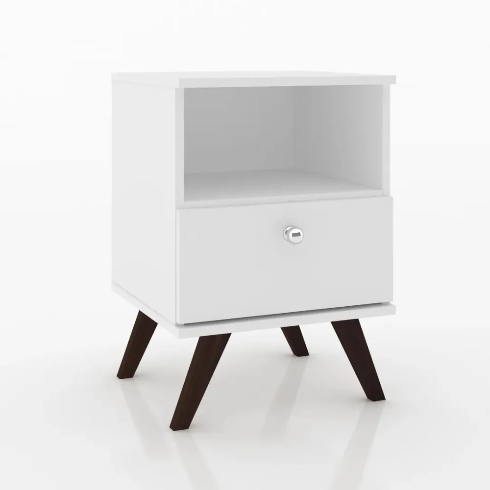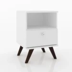 Las patas de la mesita son de madera oscura, con una forma cónica y ligeramente inclinadas, lo que le da un aspecto moderno y elegante. El tamaño compacto de la mesita la hace perfecta para espacios pequeños, proporcionando un lugar práctico para guardar objetos personales y tenerlos al alcance de la mano.