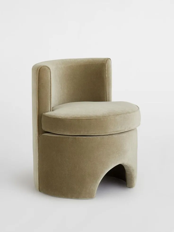 El diseño incorpora un respaldo curvo que rodea parcialmente el asiento, proporcionando soporte y un detalle estético único. La base presenta un elegante detalle de líneas verticales, que añade un efecto visual sofisticado y armonioso.