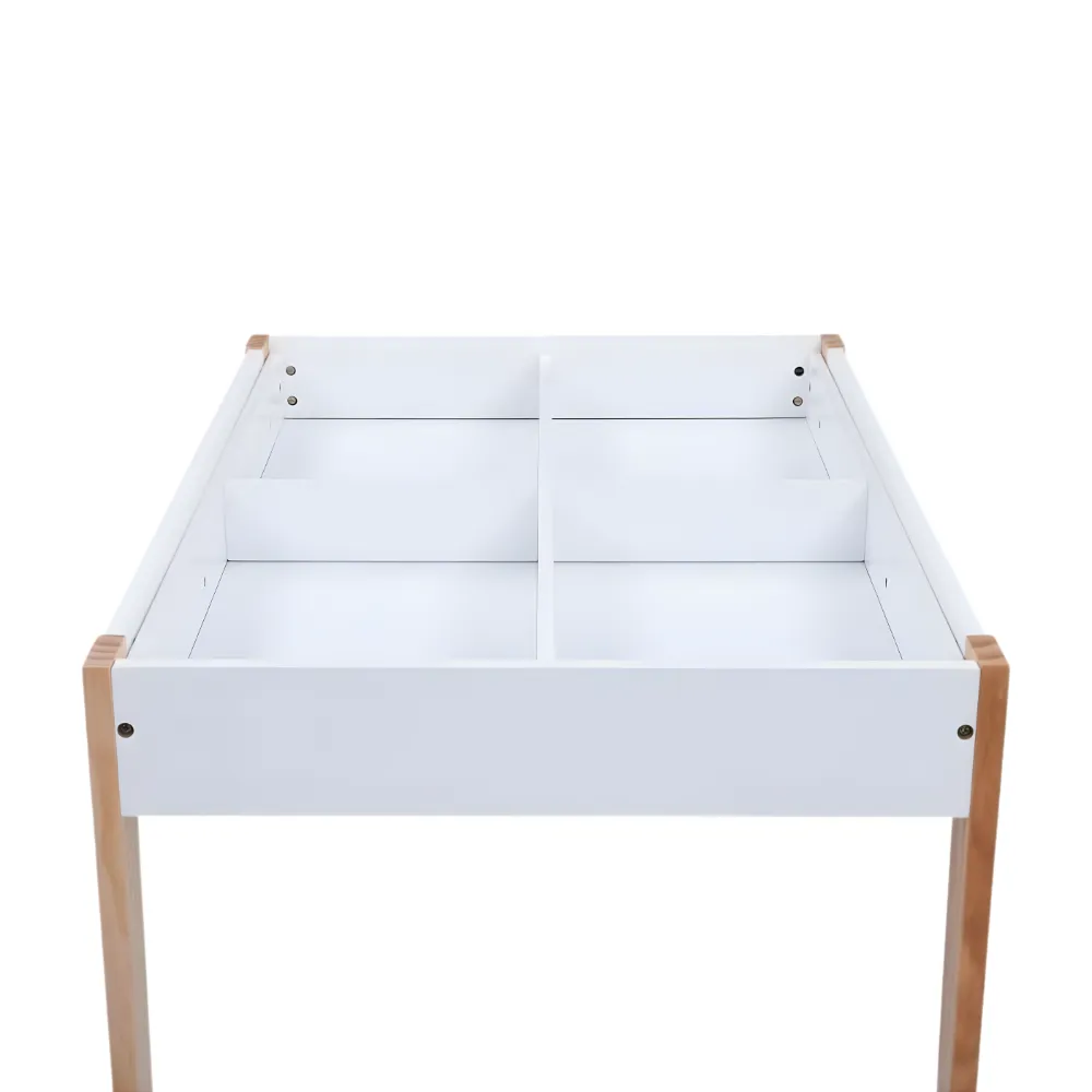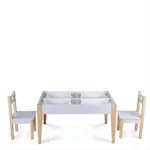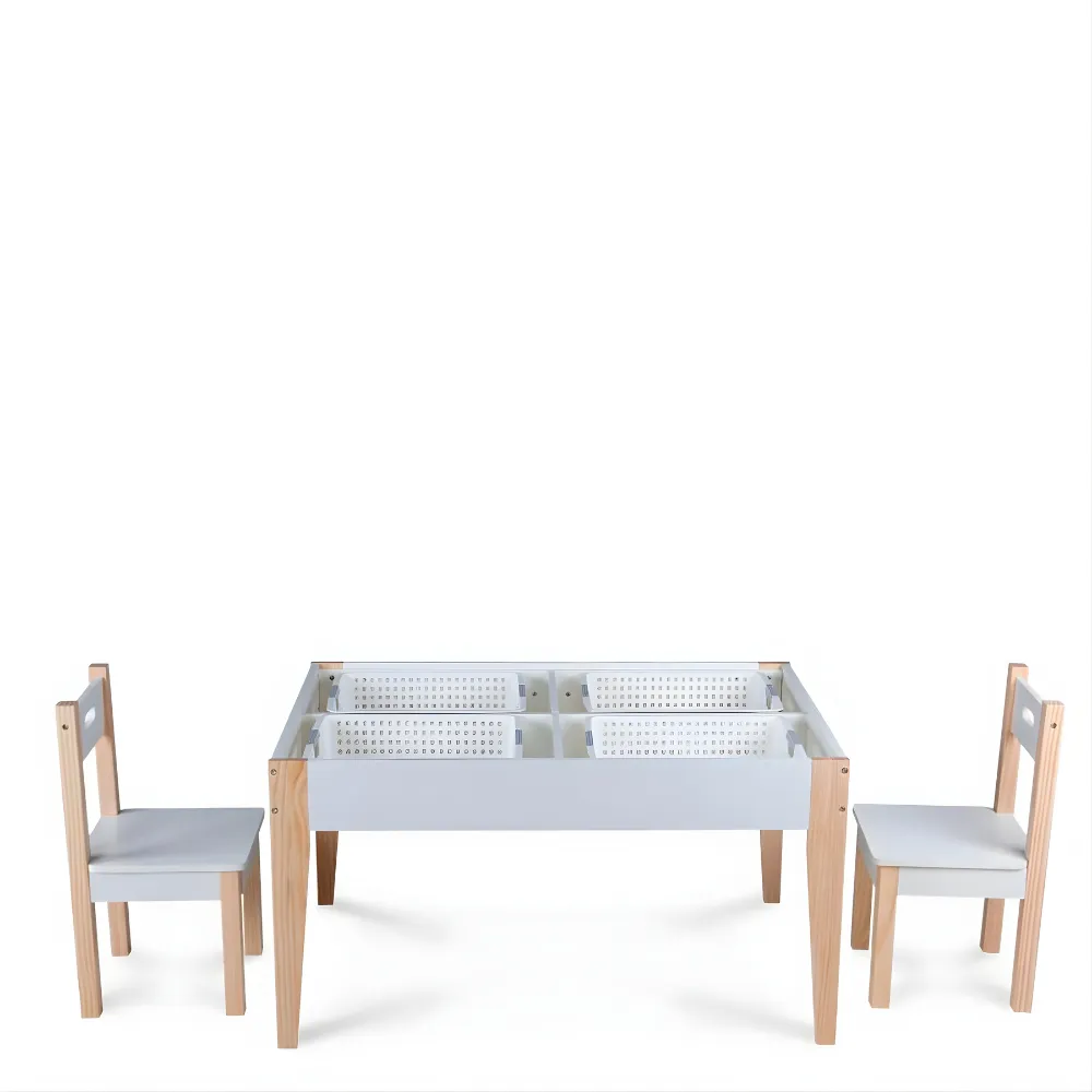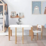 El conjunto es ideal para crear un espacio de juego, estudio o merienda en la habitación de un niño. Su diseño versátil y sus colores neutros se adaptan a cualquier estilo de decoración infantil.
