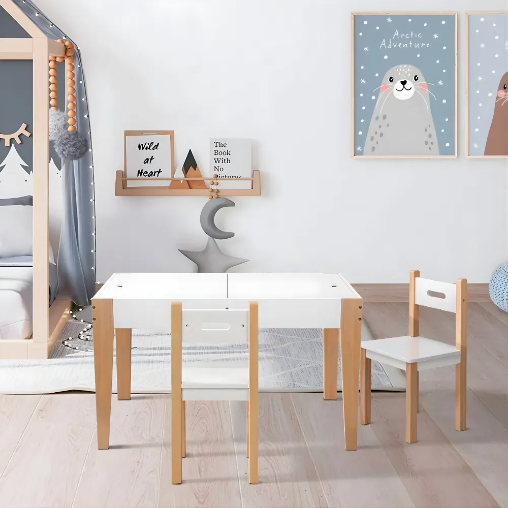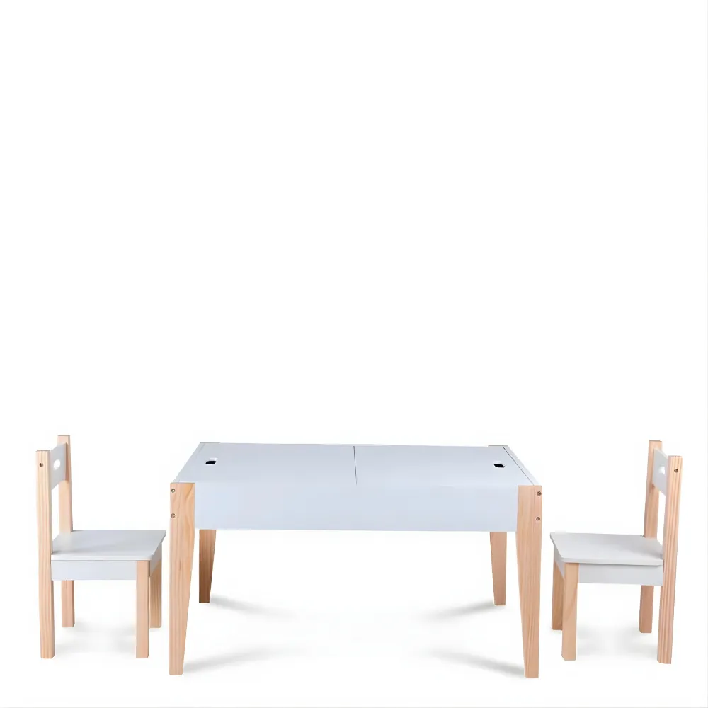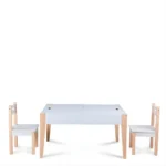 El conjunto incluye una mesa rectangular, dos sillas y un banco de almacenamiento, diseñados para niños pequeños. La mesa tiene una superficie de trabajo de madera clara, ideal para dibujar, escribir o realizar otras actividades creativas. Las sillas tienen un diseño sencillo y funcional, con asientos cuadrados acolchados y respaldos altos para mayor comodidad.