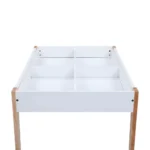 El banco de almacenamiento, también de madera clara, ofrece espacio adicional para guardar juguetes y otros objetos.