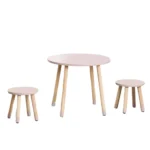 El conjunto incluye una mesa redonda y tres sillas, diseñadas para niños pequeños. La mesa tiene una superficie blanca y patas de madera clara, lo que le da un aspecto minimalista y moderno. Las sillas son de tres colores diferentes: rosa, gris claro y gris oscuro, con patas de madera clara a juego.
