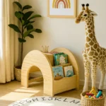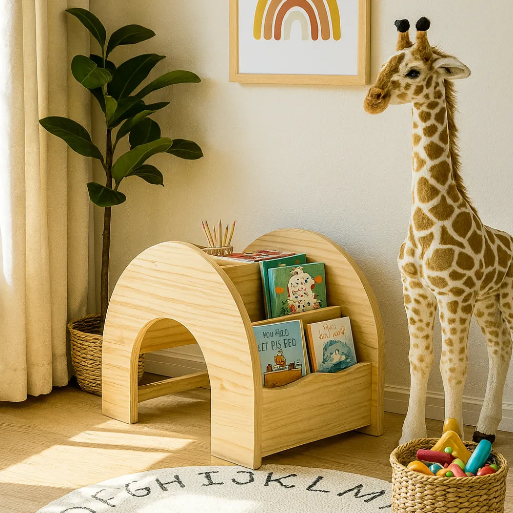 Este librero infantil presenta un diseño innovador y funcional que estimula la organización y el amor por la lectura desde temprana edad. Su estructura en forma de arco no solo le aporta un estilo único, sino que también permite que los niños tengan fácil acceso a sus libros y materiales favoritos. Cuenta con compartimentos abiertos que facilitan la visualización y el alcance de los cuentos, fomentando la autonomía en el aprendizaje. Además, su diseño versátil permite que funcione tanto como estantería como un espacio de juego o banco improvisado. Es una excelente opción para habitaciones infantiles, salas de lectura o áreas de juego, aportando calidez y orden.