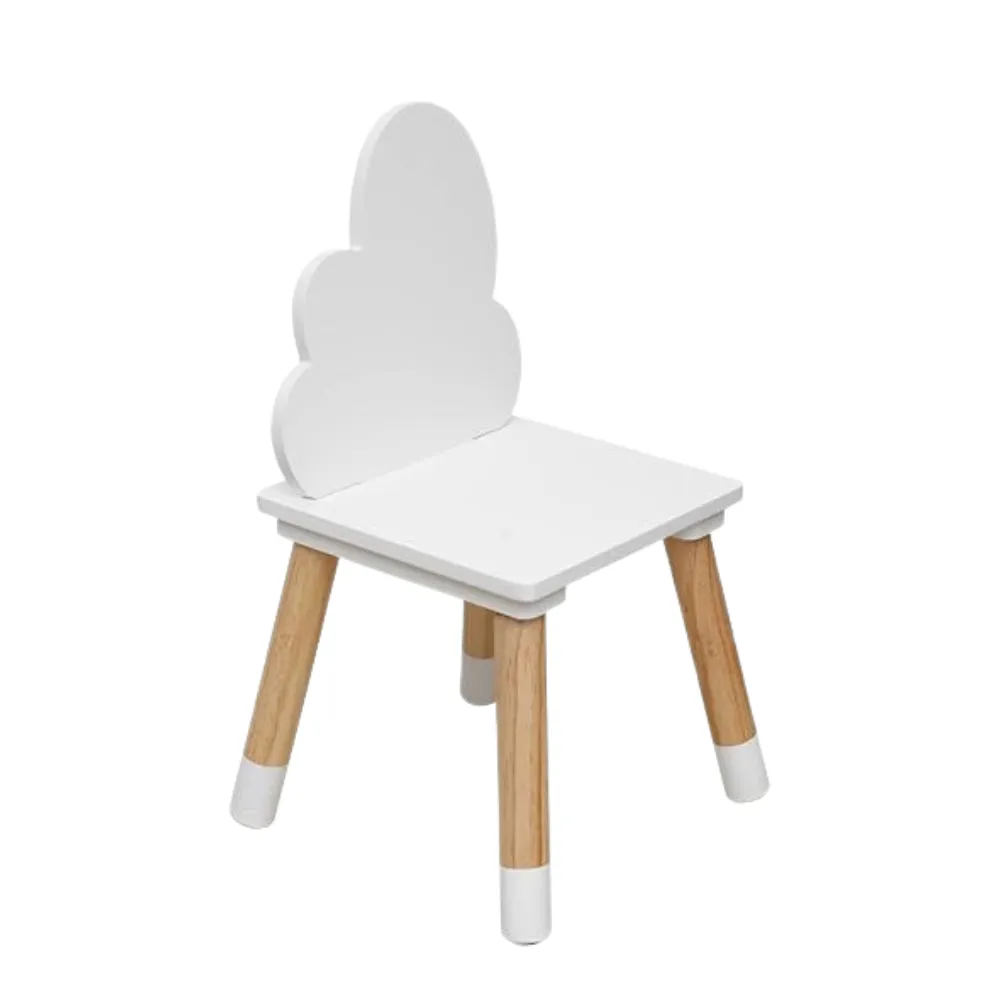 Las sillas tienen un diseño sencillo y funcional, con asientos cuadrados de madera clara y patas ligeramente inclinadas para mayor estabilidad. El tamaño y la altura del conjunto están diseñados para niños pequeños, permitiéndoles sentarse y trabajar cómodamente.