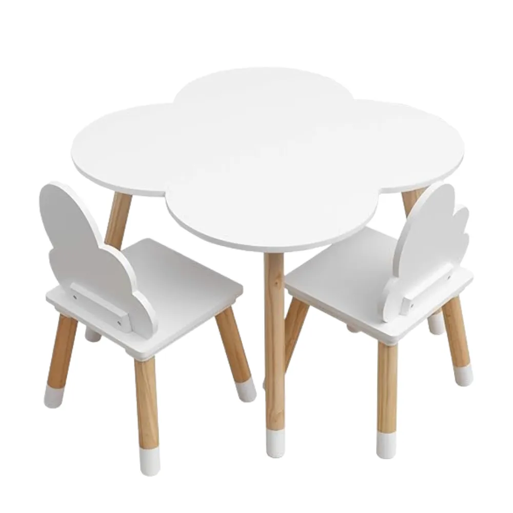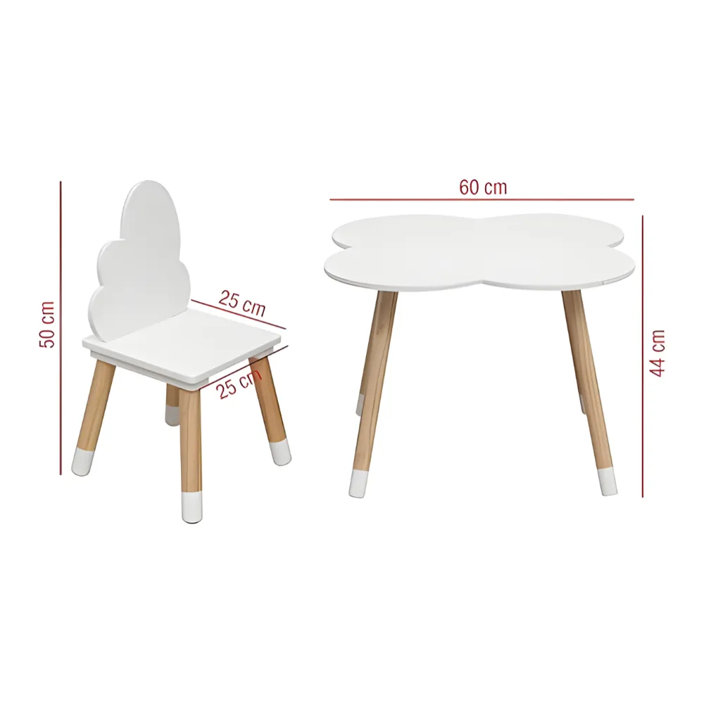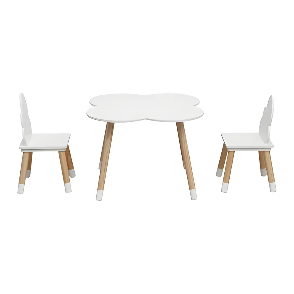 Esta encantadora mesa infantil tiene un diseño inspirado en la naturaleza, con una superficie en forma de flor que añade un toque lúdico y decorativo al espacio. Su estructura resistente y bordes suaves la hacen segura para los niños, ideal para actividades como dibujar, leer y jugar. Viene acompañada de dos sillas con respaldo en forma de alas, proporcionando un asiento cómodo y ergonómico.