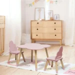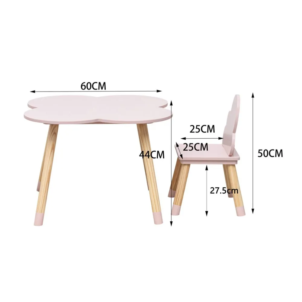 Esta encantadora mesa infantil tiene un diseño inspirado en la naturaleza, con una superficie en forma de flor que añade un toque lúdico y decorativo al espacio. Su estructura resistente y bordes suaves la hacen segura para los niños, ideal para actividades como dibujar, leer y jugar. Viene acompañada de dos sillas con respaldo en forma de alas, proporcionando un asiento cómodo y ergonómico.
