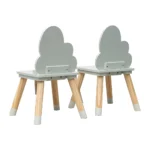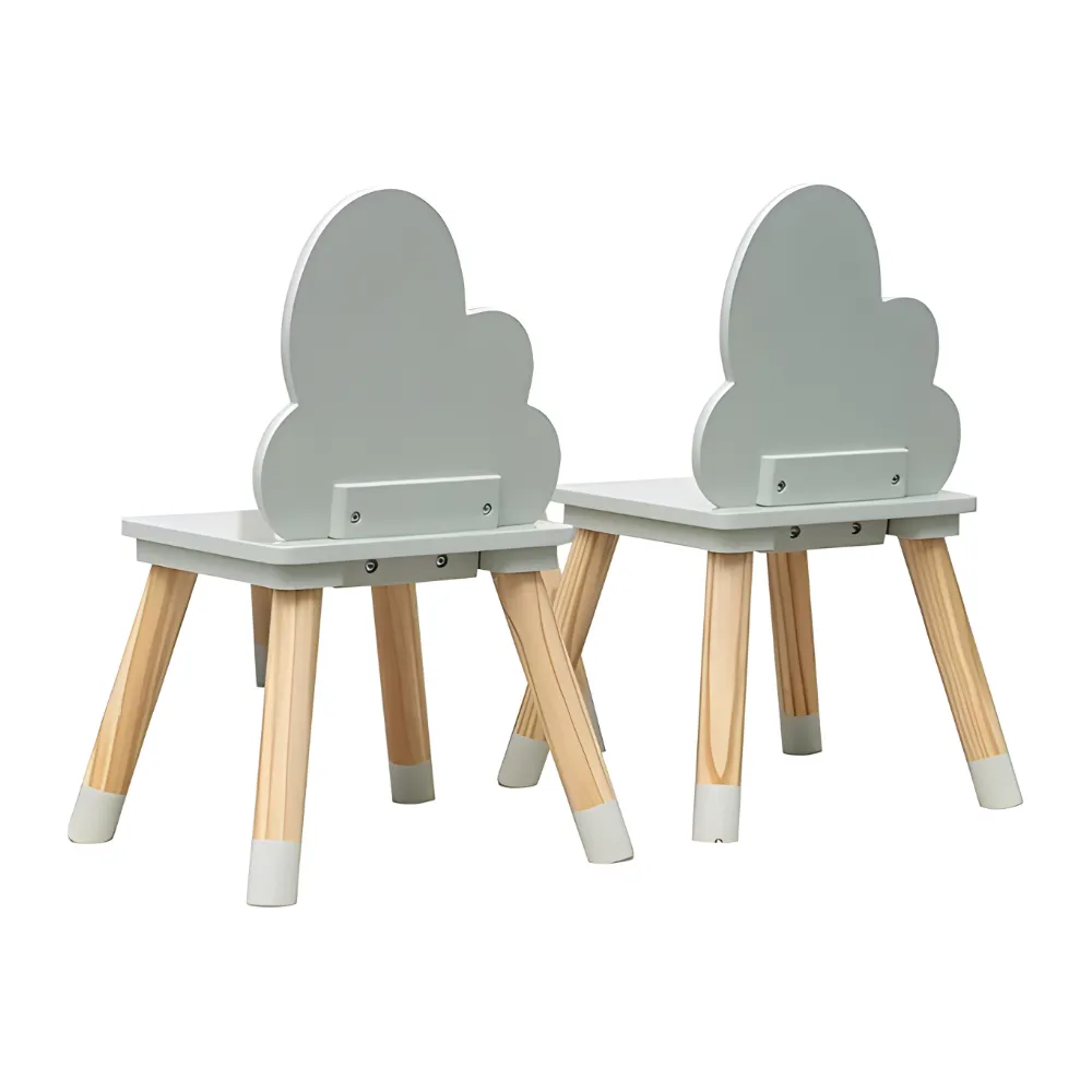 Las sillas tienen un diseño sencillo y funcional, con asientos cuadrados de madera clara y patas ligeramente inclinadas para mayor estabilidad. El tamaño y la altura del conjunto están diseñados para niños pequeños, permitiéndoles sentarse y trabajar cómodamente.