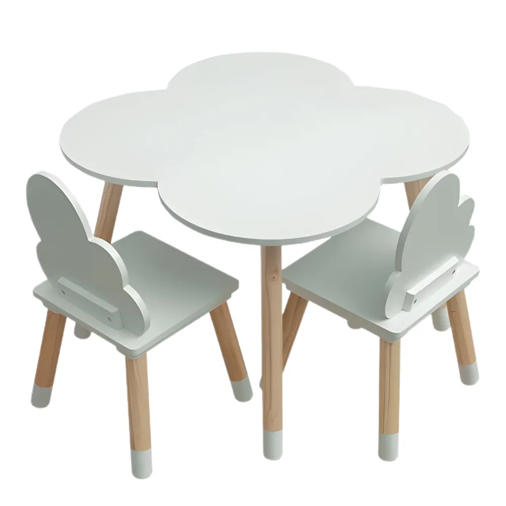 Esta encantadora mesa infantil tiene un diseño inspirado en la naturaleza, con una superficie en forma de flor que añade un toque lúdico y decorativo al espacio. Su estructura resistente y bordes suaves la hacen segura para los niños, ideal para actividades como dibujar, leer y jugar. Viene acompañada de dos sillas con respaldo en forma de alas, proporcionando un asiento cómodo y ergonómico.