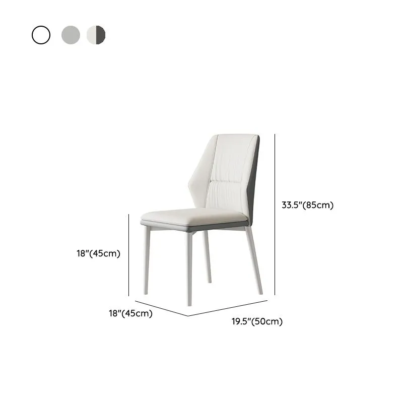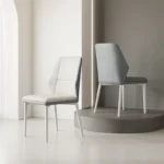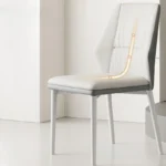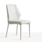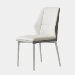Esta silla moderna combina un diseño elegante con funcionalidad y comodidad. Su asiento y respaldo están tapizados en un material sintético de color gris, con un acolchado que brinda un soporte ergonómico. El respaldo tiene una forma geométrica distintiva con líneas angulares que aportan un toque sofisticado y contemporáneo.
