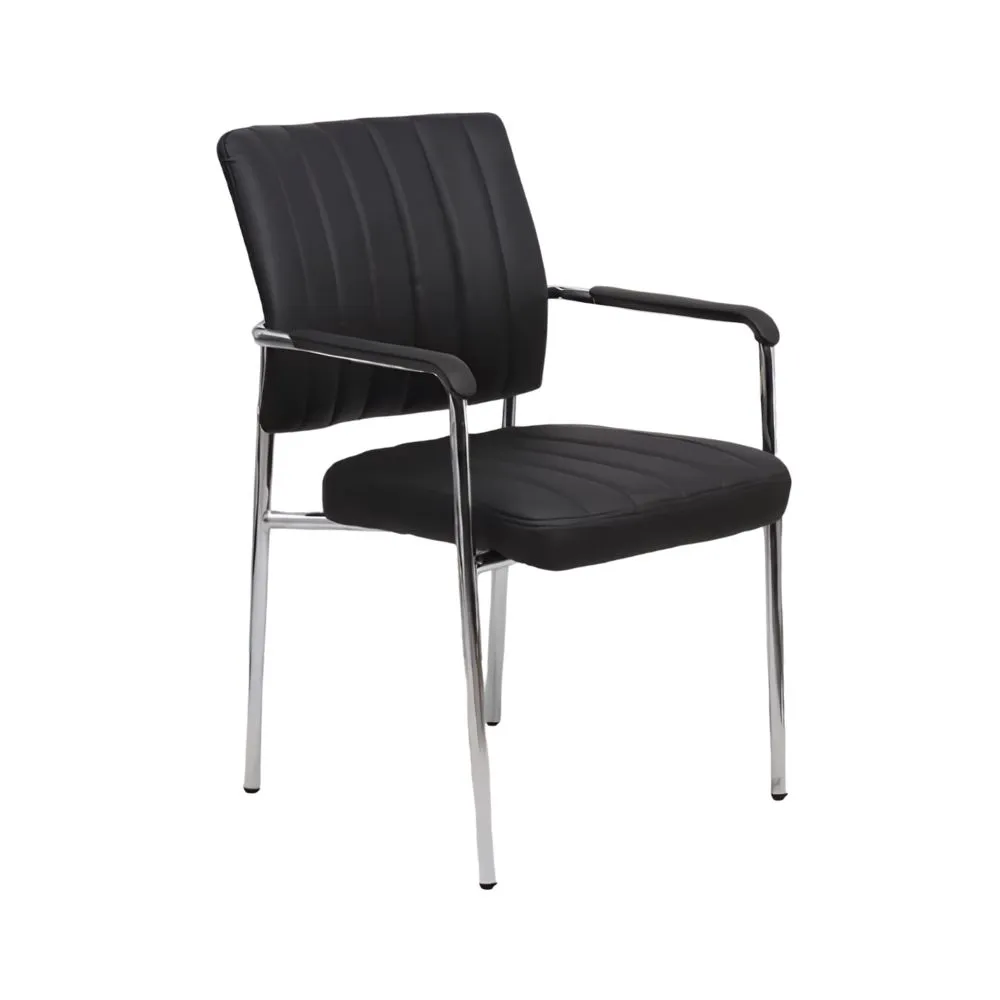 Esta silla tiene un diseño elegante y moderno, ideal para oficinas o salas de reuniones. Cuenta con un asiento y respaldo acolchados, tapizados en un material negro con costuras verticales, proporcionando comodidad y soporte. Su estructura metálica cromada le da resistencia y un acabado sofisticado.